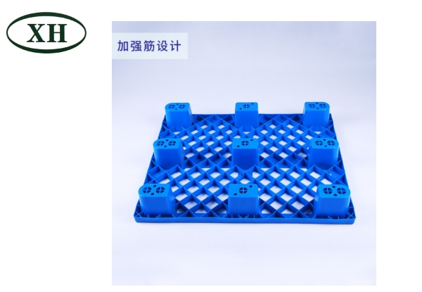 九腳塑料托盤,根據字面意思就是底部有九個腳墩的塑料托盤。它的結構和雙面塑料托盤不同的是,它閑置的時候,可以把塑料托盤進行套疊。這樣可以節省很多空間,也不易發生坍塌。。