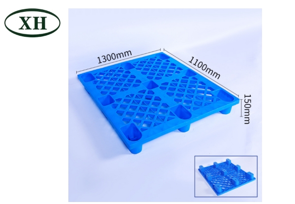 九腳塑料托盤,根據字面意思就是底部有九個腳墩的塑料托盤。它的結構和雙面塑料托盤不同的是,它閑置的時候,可以把塑料托盤進行套疊。這樣可以節省很多空間,也不易發生坍塌。。